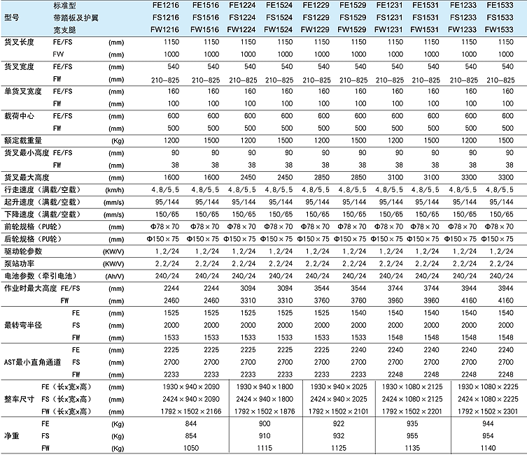 ◆ 充電器參數:輸入220V/50Hz,輸出30A/24V ◆ FE、FS型可調貨叉可定制,可調范圍340-720mm ◆ Fn系列支腿外寬為1197-1502可調 ◆ 最小直角通道AST是按照托盤尺寸(長×寬)1200mm×l000mm計算出來的 ◆ 對于貨叉可調型,貨叉必須對稱調節,防止偏載失衡